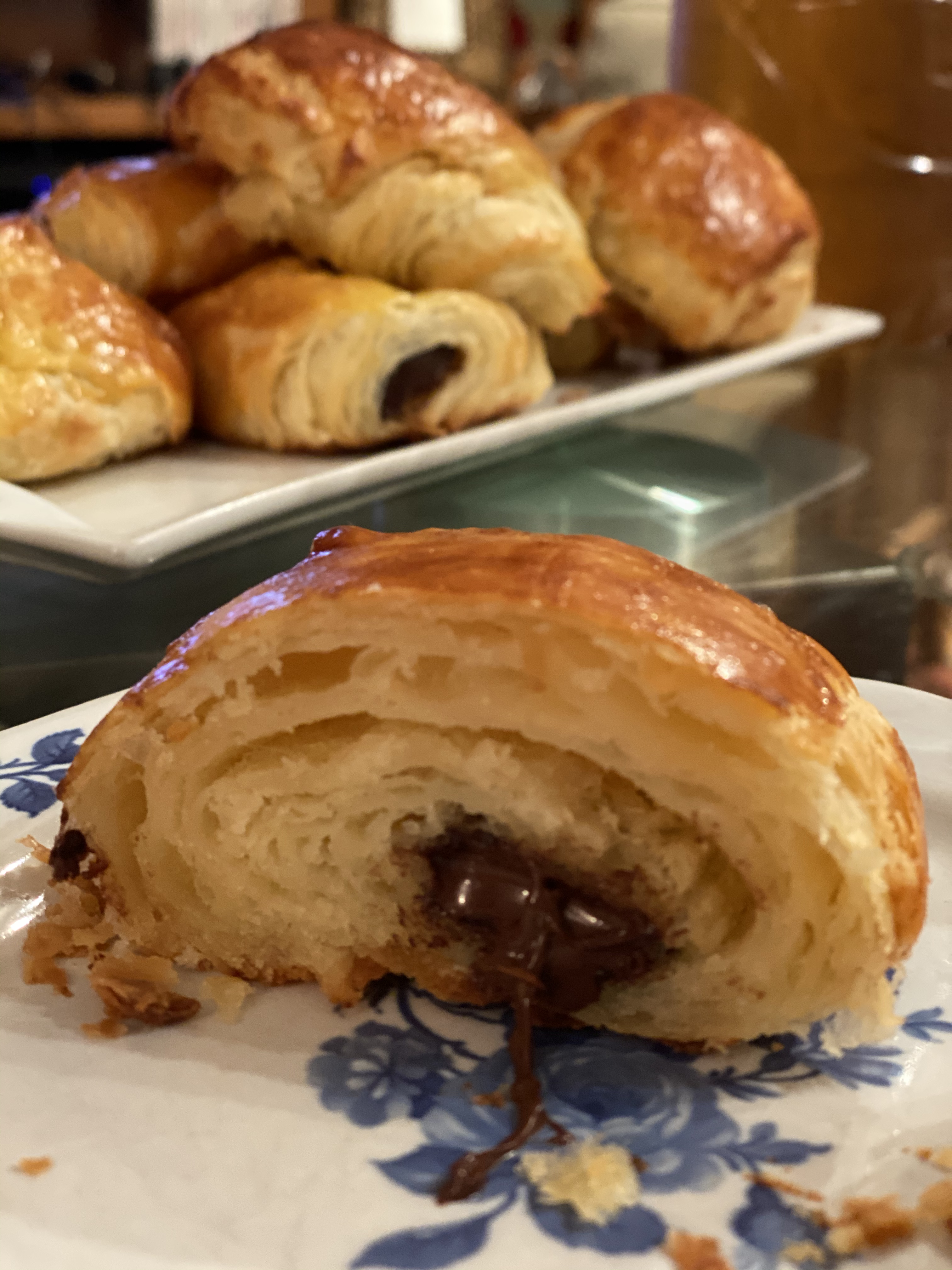 Para hacer pain au chocolat, cuando se incorpora la maneta con la masa, ambas deben estar muy frías y a veces es bastante trabajoso… Y de hecho mi manteca no estaba lo suficientemente fría para incorporarla así que, cuando traté de amasarla, se me pegó a los dedos y en toda la mesada. De todas maneras, los puse en el horno haciendo lo mejor que pude y, en cuanto a sabor, salieron deliciosos.
